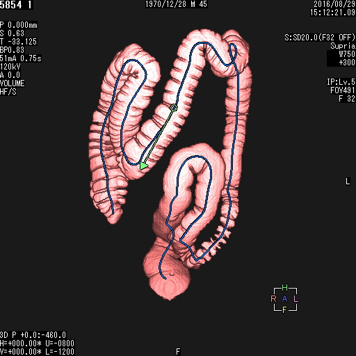 その後、コンピューター処理によって 大腸の三次元画像を作成し、大腸の腫瘍性病変などを診断する方法です。大腸内視鏡のように内視鏡を入れたり、注腸X線検査のように肛門からバリウムを注入したりせずに、楽に短時間で検査をすることができます。